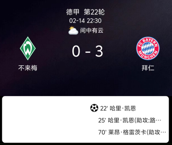 北京时间2月14日22点30分,德甲第22轮,不莱梅在主场威悉球场对阵拜仁慕尼黑。上半场,卡尔造点,凯恩主罚点球命中,不莱梅后场失误,凯恩梅开二度,迪亚斯半单刀机会被扑。下半场,格吕尔头球中柱,格雷茨卡再进一球。最终拜仁慕尼黑3-0完胜不莱梅。本场比赛过后,拜仁慕尼黑积57分领先多特6分,不莱梅积19分排在倒数第三。